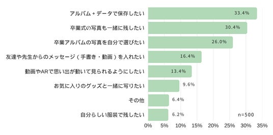 「あったらいいと思う卒業アルバム」について尋ねたところ、従来の形式にとどまらないニーズが多く見られました。