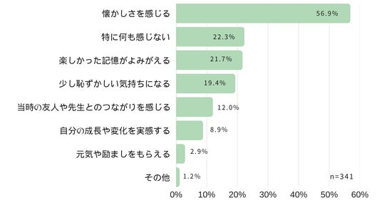 一方で「楽しかった記憶がよみがえる」 「少し恥ずかしい気持ちになる」がそれぞれ約20%、さらに「特に何も感じない」も約20%という結果となりました。