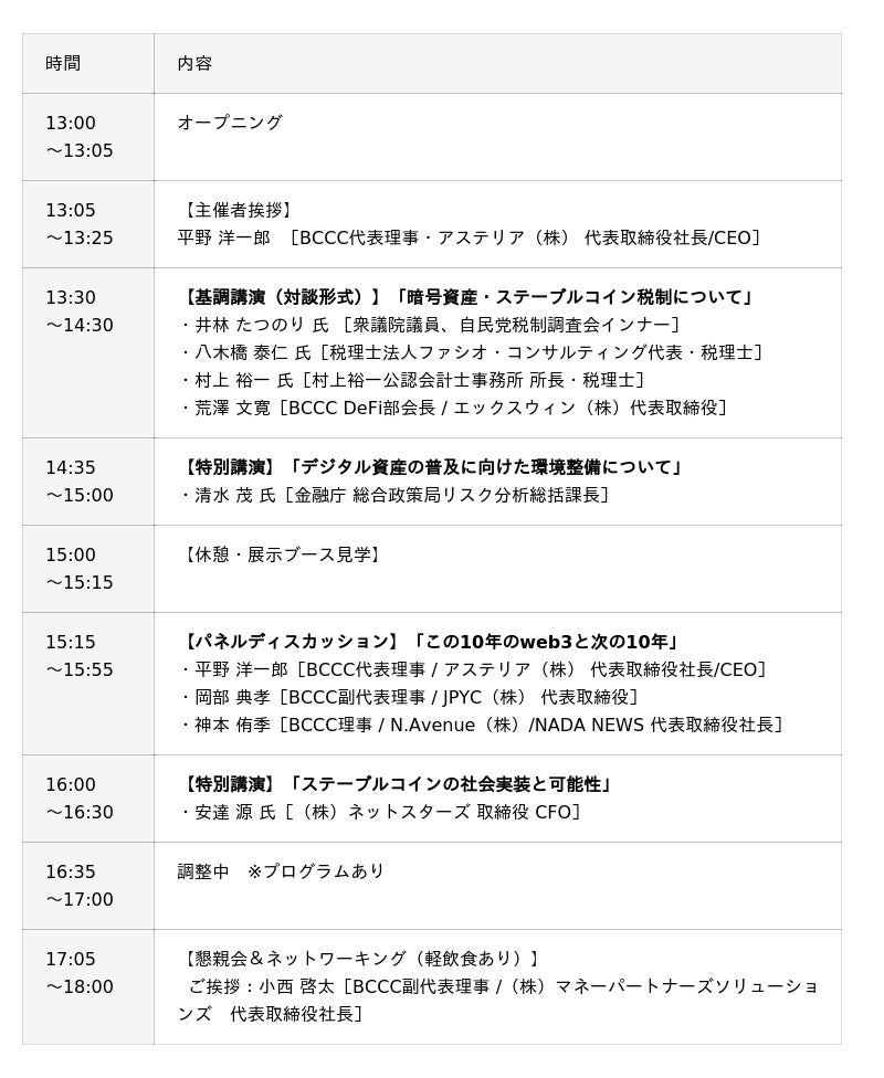 基調講演では、衆議院議員・井林たつのり氏が暗号資産・ステーブルコイン税制について対談。さらに金融庁 総合政策局リスク分析総括課長清水氏による講演や、羽田空港などでのUSDCの決済サービスの実証を行っているネットスターズ社CFOの安達氏による講演を予定しています。パネルディスカッションでは、代表理事の平野(アステリアCEO)と副代表理事の岡部(JPYC 代表)が、「この10年のweb3と次の10年」について対談しブロックチェーンが社会基盤として根付くための「次の10年」を議論します。
