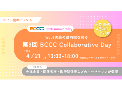 一般社団法人ブロックチェーン推進協会(本部:東京都渋谷区、代表理事:平野洋一郎、以下BCCC)は、2026年4月に設立10周年を迎えることを記念し、当協会最大のカンファレンス「第9回 BCCC Collaborative Day」を2026年4月21日(火)に日本橋・室町三井ホール&カンファレンスにて開催することをお知らせします。