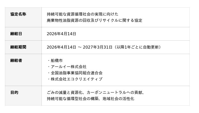 食のサプライチェーンの課題に、現場視点とデータで挑むアールイー株式会社(本社:東京都豊島区、代表取締役:今井直樹、以下「アールイー」)は、船橋市(市長:松戸 徹)、全国油脂事業協同組合連合会(会長:中川太、以下「全油連」)、株式会社エコクリエイティブ(代表取締役:堀敦博、以下「エコクリエイティブ」)と、「持続可能な資源循環社会の実現に向けた廃棄物性油脂資源の回収及びリサイクルに関する協定」(以下「本協定」)を、2026年4月14日付で締結いたしましたので、お知らせいたします。