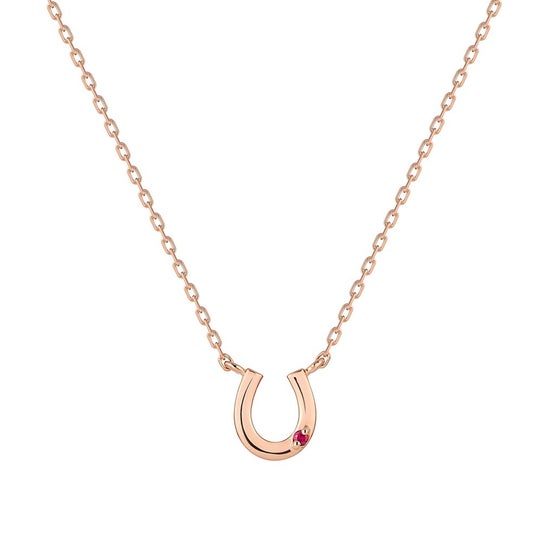 リバーシブルデザインの馬蹄ネックレス。表面はキュービックジルコニアの留め華やかに。裏面は深い愛情をもたらすと言われるルビーを1粒留め、フラットな地金の煌めきも楽しめるカジュアルなデザインに。トレンドのミニマムなサイズ感で、さりげなく身に着けられるアイテムです。