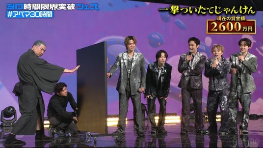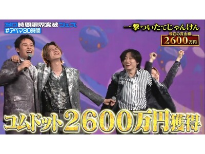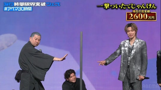 過酷なミッションの連続で賞金が減額されていく中、この時点でコムドットに残された賞金は2600万円。ステージ上では、グランドフィナーレを飾る最後の企画「一撃ついたてじゃんけん」のルールが説明されました。コムドットの代表者1人と芸人チームの対戦相手がついたて越しに一発勝負のじゃんけんを行うという究極の心理戦。1分間であれば出した手を変えることが可能ですが、勝てば賞金2600万円を全額獲得、負ければ0円となってしまいます。さらに芸人チームが勝った場合、賞金100万円を芸人チームも獲得できるというルールが明かされました。