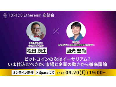 株式会社TORICO(本社:東京都千代田区、代表取締役社長:安藤拓郎、以下「当社」)は、イーサリアムを中心とした暗号資産に関する情報発信の一環として、楽天ウォレット株式会社 シニアアナリスト 松田康生氏をゲストに迎え、暗号資産市場の動向および今後の展望に関する音声対談を、X(旧Twitter)スペースにて開催することを、下記の通りお知らせいたします。