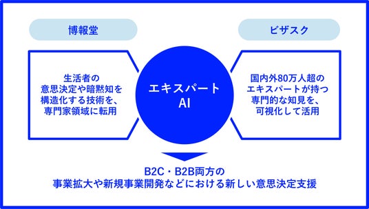 このたびの資本業務提携では、新規事業開発や市場参入・マーケティング戦略立案に取り組む企業の担当者に向けて、ビザスクのエキスパートが持つ業界特有の常識や視点と、博報堂が培ってきた意思決定の思考構造化のノウハウおよびAIエンジンを組み合わせたAIサービス「エキスパートAI」を共同開発します。
