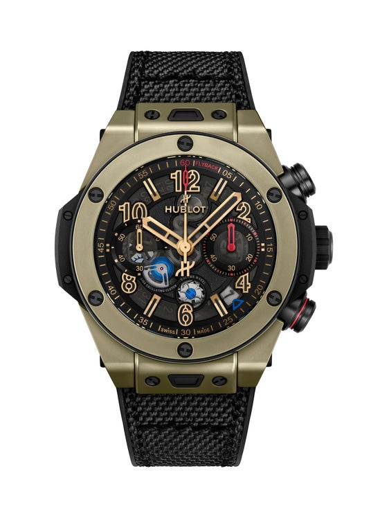 「ビッグ・バン リローデッド」は、ウブロの素材に対する卓越した技術と、重要なアニバーサリーを祝います。それは、「オールブラック」コンセプト(2006年)の20周年と、「マジックゴールド」(2011年)の15周年です。これらの定番コレクションは、数十年にわたる研究、革新、クラフツマンシップをひとつのアイコンへと融合させています。マジックゴールドのモデルは、スイス連邦工科大学ローザンヌ校の冶金研究所との4年にわたる共同研究を経て誕生し、ニヨンのウブロマニュファクチュールで完全に自社製造された独特のブロンズのような輝きをもつ、ダイヤモンドに次ぐ硬度を誇る世界初の「傷の付きにくい18Kゴールド」を採用しています。セラミックは3つのモデルで展開されます。ひとつは、「インビジブル・ビジビリティ(見えない可視性)」という革新的なコンセプトの20周年を記念する「オールブラック」エディションです。加えて、ブルーとダークグリーンのモデルには、従来のセラミックよりも300ビッカース高い硬度を誇る、ウブロのフルカラーハイテクセラミックが採用され、その高い技術力を体現しています。5つ目のモデルは、チタニウムとブラックセラミックを融合させたモデルです。軽量な航空宇宙グレードのチタニウムとテクニカルセラミックを組み合わせることで、高い耐久性を確保しています。また、2013年に発売された初代「ビッグ・バン ウニコ」と同様に、チタニウム製のベゼルとケースにブラックセラミックのケースバックを組み合わせ、卓越した堅牢性を実現しています。