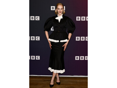 エマ・レアードは、ブラックとホワイトのコーディネートにブラックのサテンパンプスを合わせました。