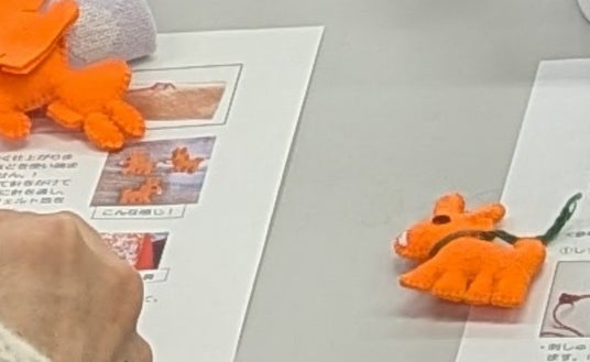 マスコットづくりの材料と道具は、麻生センターに全て準備してあるので、気軽に立ち寄れます。都合のよい時間で自由に参加し、フェルトに下地を書いて切り取り、目鼻を接着剤で付けて綿を入れて縫い付けます。手仕事をしながらお互いの時間を共有し、参加者の居場所づくりにもつなげます。