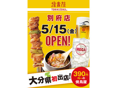 株式会社エターナルホスピタリティジャパン(本社:大阪市中央区 代表取締役社長:青木繁則)が展開する焼鳥屋「鳥貴族」は、大分県で初出店となる、別府店を5月15日(金)にオープンいたします。