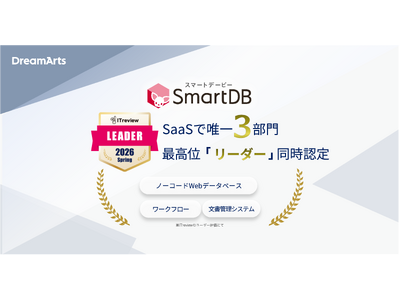 大企業向けクラウドサービスの株式会社ドリーム・アーツ(東京本社:東京都渋谷区、広島本社:広島県広島市、代表取締役社長:山本 孝昭、以下 ドリーム・アーツ)は、このたび大企業向け業務デジタル化クラウド「SmartDB(R)(スマートデービー)」が、アイティクラウド株式会社(本社:東京都港区、代表取締役社長:黒野 源太)が運営するIT製品レビュープラットフォーム「ITreview(アイティレビュー)」で発表された「ITreview Grid Award 2026 Spring」においてSaaSで唯一、最高位の「Leader」に3部門で16期連続同時認定されたことをお知らせします。