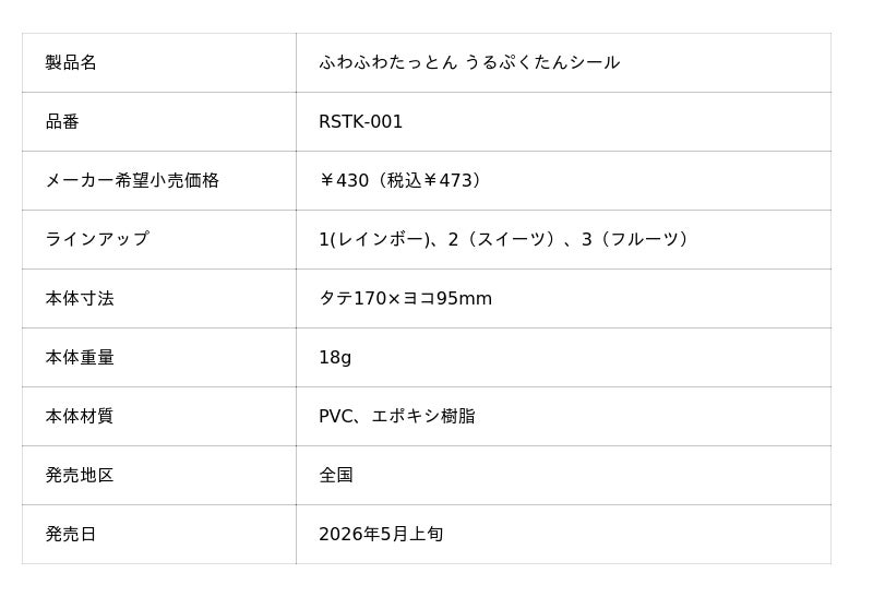 ナカバヤシ株式会社(本社:大阪市中央区、社長:中林一良)は、株式会社サンレモン(本社:東京都豊島区、社長:白鳥聡)とコラボレーションした「うるぷくたんシール ふわふわたっとん」を2026年5月上旬より全国で順次発売します。