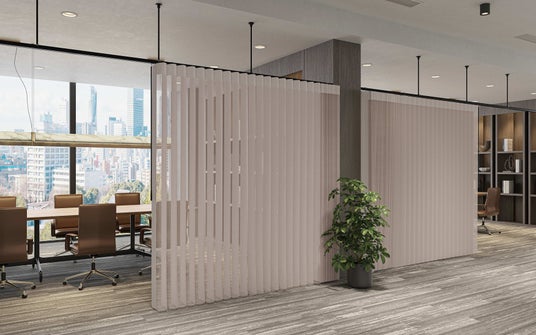 吊棒にファブリック製品を取り付けることで、間仕切りとしての活用が可能です。オフィスではゾーニング用途として空間を緩やかに区切り、医療施設やサロンでは視線を遮る目隠しとして、また店舗では空間を区分する仕切りとして活用できます。ロールスクリーン「ラルクシールド」、調光タテ型ブラインド「エアレ」、タテ型ブラインド「ラインドレープ」、パネルスクリ―ンなどに対応しており、用途や空間に応じた選択ができます。また、調光や昇降機能を備えた製品を選択することで、採光や視線の調整が可能となり、利用シーンに応じた空間演出に対応します。ファブリック製品ならではの豊富な生地ラインナップで、空間デザインに応じた選択が可能です。