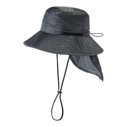 遮光・UVカット・遮熱・はっ水性を兼ね備えた傘生地を使用した遮光ハット。つば裏に収納できるネックガード付き。