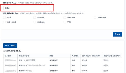 リスト取得画面にて、特定のキーワードを指定して「会社名」で検索できる 機能を追加しました。