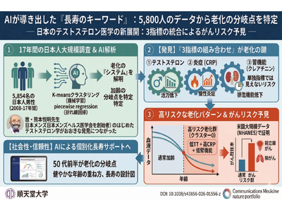 順天堂大学大学院医学研究科の奥井伸雄 客員教授と堀江重郎 特任教授の研究グループは、17年間にわたる大規模調査に基づき、男性の「長寿」と「老化」を分かつメカニズムをAI(人工知能)を用いて解明しました。