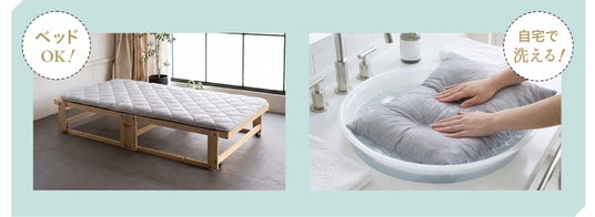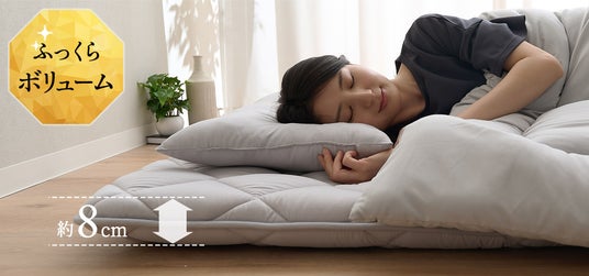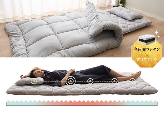 和布団の持つふんわりとしたやわらかさはそのままに、耐久性と体圧分散性をプラスした新設計に進化。芯材の高反発ウレタンが理想的な寝姿勢を保ち、長時間使っても薄くなりにくい耐久性を実現。