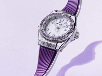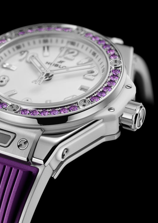 36個のアメジストを配し、アイコニックなH型ビスをあしらったベゼルが、3針と日付表示を備えたシャイニーホワイトのダイアルを縁取ります。約40時間のパワーリザーブを誇る自動巻きムーブメント「HUB1120」を搭載し、ウブロが特許を持つ「ワンクリック」ストラップ交換システムを備えています。ワンクリックで簡単に付け替え可能な2本のストラップ、ひとつはジェムストーンのカラーに合わせたセンターインサートにホワイトのラインが入ったラバーストラップ、もうひとつはホワイトラバーストラップが付属します。
