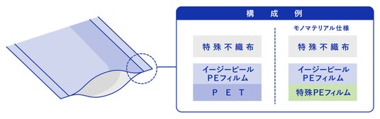 モノマテリアルタイプは、DNPが持つコンバーティング技術により、耐熱性に課題があり加工が難しいモノマテリアル構成でも製袋加工を可能にし、自社従来品と同等のイージーピール性を実現しました。材料の90wt%以上がポリエチレン系で構成されており、従来の複合材料に比べてリサイクル工程での選別性及び再資源化プロセスへの適合性を高めた設計です。