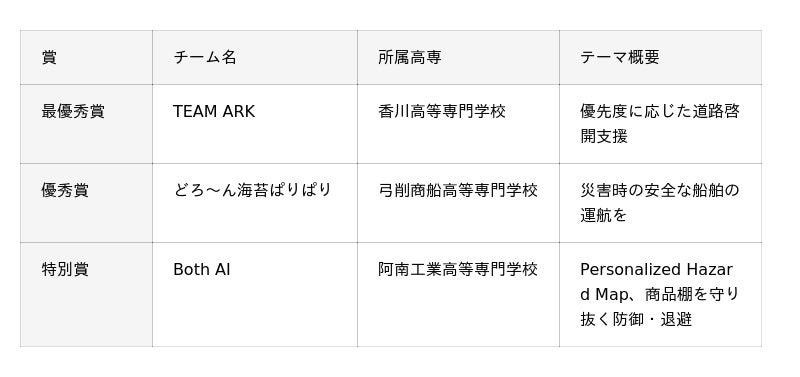 このたび最優秀賞をいただき、大変光栄に思います。私たちは、災害時に最も重要となる「道路状況の把握」に着目し、ドローンで迅速にモニタリングできる仕組みを形にしました。初めてのハッカソンで多くの試行錯誤がありましたが、その経験が今回の受賞につながったと感じています。今回の学びを生かし、今後も技術を通じて防災に貢献できる取り組みに挑戦していきたいです。