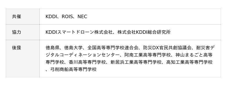KDDI株式会社(本社:東京都港区、代表取締役社長 CEO:松田 浩路、以下 KDDI)、大学共同利用機関法人 情報・システム研究機構(機構長:喜連川 優、以下 ROIS)、日本電気株式会社(本社:東京都港区、取締役 代表執行役社長 兼 CEO:森田 隆之、以下 NEC)の3者は、2026年3月27日、阿南工業高等専門学校(徳島県阿南市)にて南海トラフ大地震への備えに向けた「ドローン×生成AI 防災ハッカソン 2026」(以下 本ハッカソン)を実施しました。