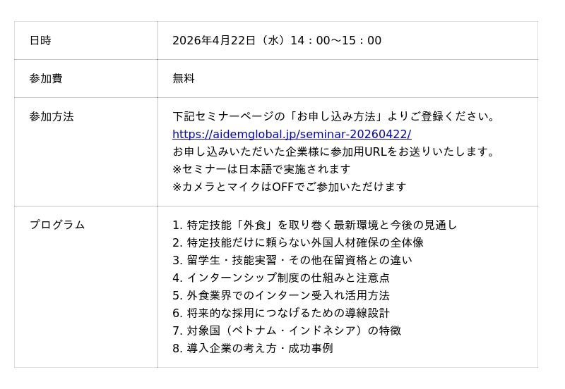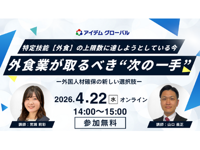 総合人材情報サービスの株式会社アイデム(東京都新宿区 代表取締役社長:椛山 亮)が展開するアイデムグローバルは、外食業の採用担当者向けに外国人材確保に関する無料のオンラインセミナーを開催いたします。 特定技能「外食」の上限数により採用が難しくなる中、「特定技能が使えない=もう打つ手がない」わけではありません。本セミナーでは、外食業界における外国人採用を複数の選択肢から整理し、その中でも近年注目されている「外国人大学生インターンシップ制度」を実例も交えながらわかりやすく解説いたします。