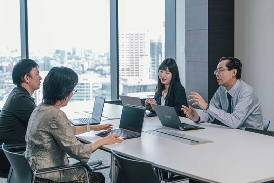 明電舎の担当者がSansanの情報をもとに話し合いをしている様子