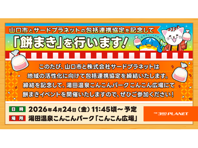 株式会社サードプラネット(本社:山口県周南市、代表取締役社長:志野一夫、以下「当社」)は、山口県山口市(市長:伊藤和貴)と、2026年4月24日(金)に包括連携協定を締結し、地域の活性化に向けたふるさと応援企画「ふるさと山口ぐるんぐるん物語」の第5弾をスタートいたします。