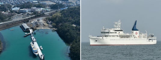 左写真|鳥羽商船高等専門学校の外観(奥側)・練習船が停泊する桟橋(手前側)、右写真|令和7年3月竣工の練習船鳥羽丸四代目