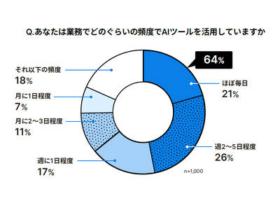 週1日以上AIツールを利用している割合は64%、うち20%以上が毎日利用しており、業務への浸透が急速に進んでいる。