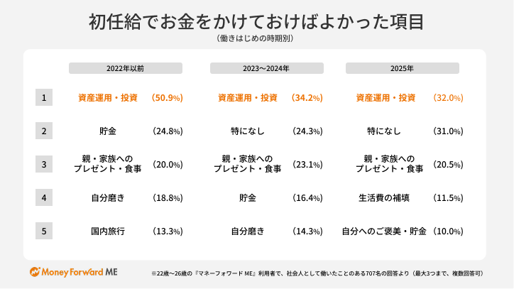 なお、社会人として働き始めた時期が2022年以前の人では「資産運用・投資(NISAなど)」にお金をかけておけば良かったという回答が50.9%と、他の年次と比較して割合が高い傾向にありました。