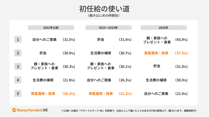初任給を「資産運用・投資」に使ったと回答する割合が高まっていることです。例えば、社会人として働き始めた時期が2022年以前の人で「資産運用・投資(NISAなど)」に初任給を使ったと回答した人の割合は10.3%ですが、2023年~2024年の人は21.3%、2025年の人は37.5%という結果が出ています。2022年以前と、2025年を比較すると約3.6倍という結果が見られました。2022年からは高校での金融教育が義務化が開始されており、若年層の間で資産形成に対する意識が早期に醸成されていることが推察されます。