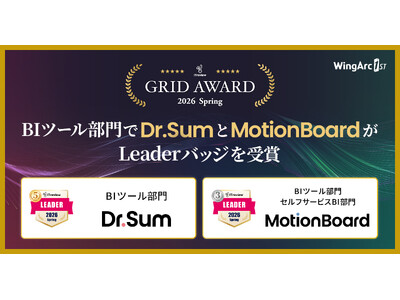 ウイングアーク1st株式会社(本社:東京都港区、代表取締役 社長執行役員CEO:田中 潤)は、アイティクラウド株式会社が運営するB2B向けIT製品/SaaSのレビュープラットフォーム「ITreview」が発表した「ITreview Grid Award 2026 Spring」の BIツール部門において、データマネジメント基盤「Dr.Sum」とデータアプリ基盤「MotionBoard」が、認知度・満足度が共に高く評価されている製品 として「Leader」を受賞したことをお知らせします。