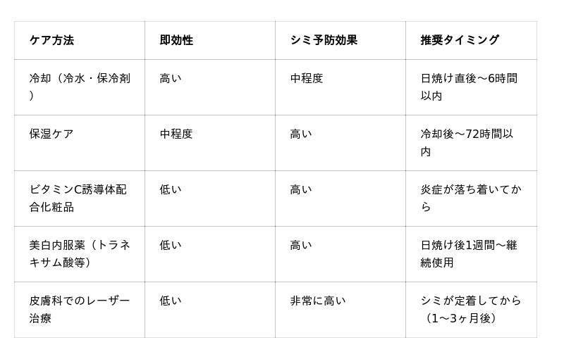 A. 「冷却→保湿→美白」の順序を守り、72時間以内の集中ケアが重要です。