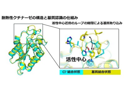 基質が存在しない野生型酵素では、活性中心近傍に Cl⁻ が結合しており、活性部位の近くにある「ふた」にあたる部分は、比較的閉じた状態にある(水色)。一方、低分子化合物p-nitrophenol を結合させた変異体では、この「ふた」が異なる配置をとる(黄色)。この比較から、活性部位近傍の可動領域が、結合する分子に応じて構造変化することが示された。