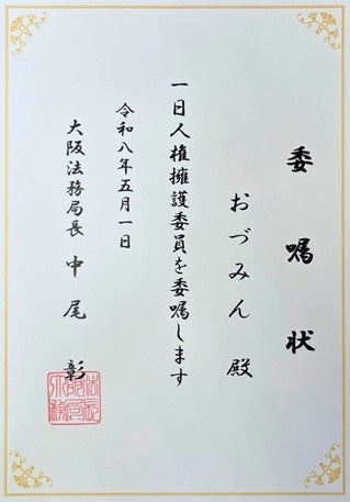 【大阪法務局長名で委嘱された「一日人権擁護委員」任命書】