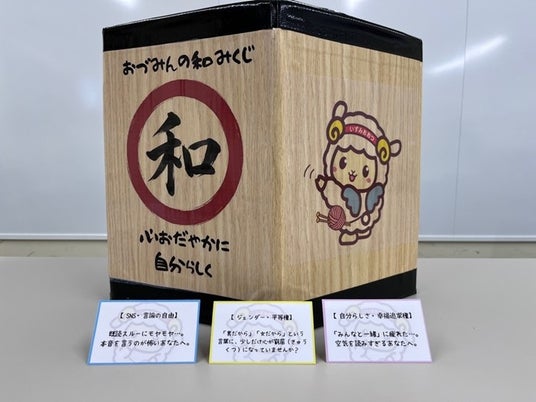 内容 おづみんがくじ箱を持ち、来場者に「憲法くじ(おづみん和みくじ)」を引いてもらいます。憲法くじは全150個の数量限定で、5月1日の市役所ロビーと駅前啓発で活用し、残りは5月7日・8日のロビー展示で配布します。くじには、人権を身近に考えるメッセージを記載しています。