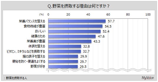 野菜を摂取する人の理由は(複数回答)、「栄養バランスを整える」が57.7%、「食物繊維が豊富」が54.5%、「おいしい」が52.4%です。
