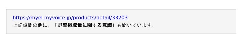 野菜の摂取状況や好き・嫌いな野菜、自由記述にて摂取時に気をつけていることなどについて聞いています。調査結果をお知らせいたします。