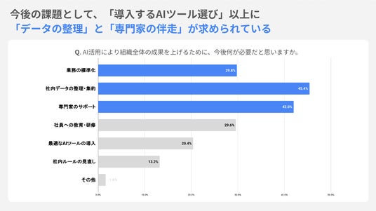 - 今後のAI活用において必要なことを聞いたところ、「最適なAIツールの導入(約20%)」よりも、「社内データの整理・集約(約46%)」「専門家のサポート(約42%)」「業務の標準化(約30%)」が上位を占めました。