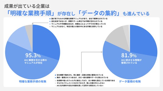 - 一方で、「期待を大きく上回る成果が出ている・期待通り」と回答した企業においては、その81.5%が「誰が見てもわかる明確な業務マニュアルが全社である(29.9%)」「部署やチーム単位で手順が定着している(51.6%)」と回答しており、AIを使う前の「共通の手順(ワークフロー)」を明文化しています。