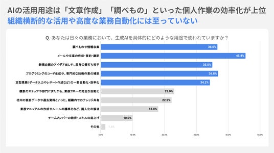 - 一方で、AIの活用用途は「メールや文章の作成(約46%)」「調べものや情報収集(約37%)」といった個人的な作業が上位を占め、