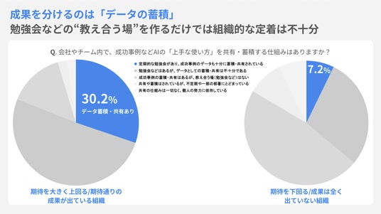 - 一方、成果を出している層では「定期的な勉強会があり、成功事例のデータも十分に蓄積されている」と回答した割合が30.2%に上り、成果不振層(7.2%)と約4倍の差が開きました。