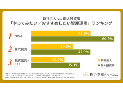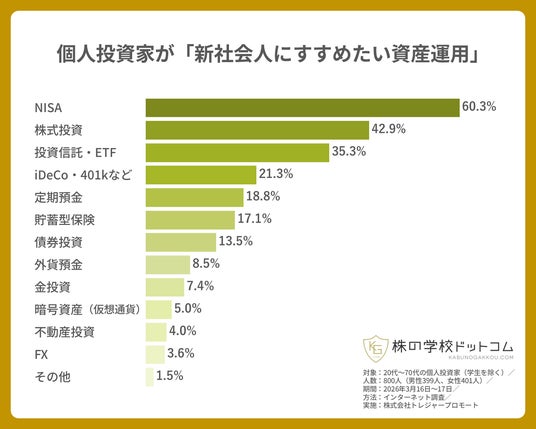 - 個人投資家が「新社会人におすすめしたい資産運用」第1位もNISA(60.3%)
