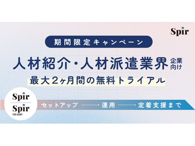 日程調整ツール「Spir(スピア)」を展開する株式会社Spir(東京都中央区、代表取締役:大山晋輔、以下当社)は、人材派遣・人材紹介業界における成約率向上と業務効率化を支援するため、業務フローに合わせたセットアップから専任CSによる定着支援までをセットにした特別キャンぺーンの提供を開始したことをお知らせします。