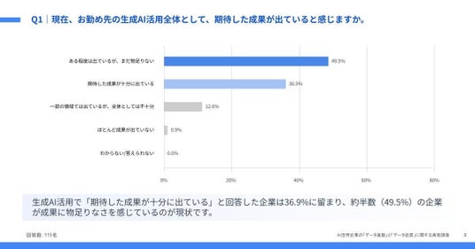 「Q1. 現在、お勤め先の生成 AI 活用全体として、期待した成果が出ていると感じますか。」(n=111)と質問したところ、「期待した成果が十分に出ている」という回答は 36.9% に留まりました。一方で、「ある程度は出ているが、まだ物足りない(49.5%)」や「全体としては不十分(12.6%)」などの回答を合わせた計 63.0% が、成果創出において何らかの課題を残している実態がわかりました。