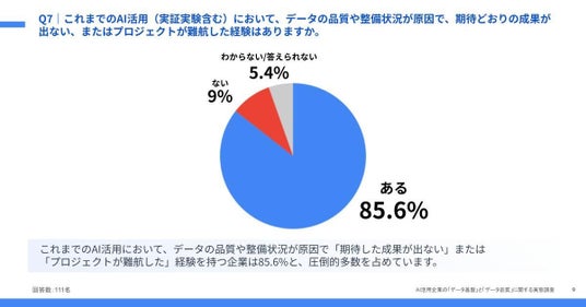 「Q7. これまでの AI 活用において、データの品質や整備状況が原因でプロジェクトが難航した経験はありますか。」(n=111)と質問したところ、85.6% が「ある」と回答しました。生成 AI 導入企業の大多数が、モデルの性能以前に「データ」という土台の部分で課題に直面している実態がわかりました。