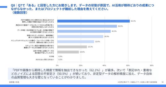 「Q8. Q7 で『ある』と回答した方にお聞きします。データの状態が原因で、AI 活用が期待どおりの成果につながらなかった、またはプロジェクトが難航した理由を教えてください。(複数回答)」(n=95)と質問したところ、「PDF や画像化された資料を AI に読み込ませたが、期待した精度で情報を抽出できなかったから」が 62.1% で最多でした。 社内に蓄積された非構造化データを AI が扱える形に構造化する「前処理」の難易度が、活用の進展を妨げる最大の壁のようです。