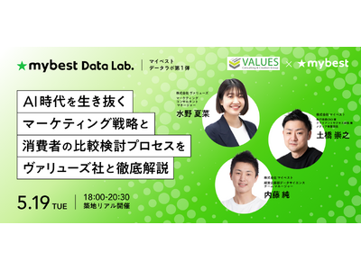 商品比較サービス「マイベスト」の運営をおこなう、株式会社マイベスト(本社:東京都中央区、代表取締役CEO:吉川 徹、以下マイベスト)は、株式会社ヴァリューズ(本社:東京都港区、代表取締役社長:辻本 秀幸、以下ヴァリューズ)と共同で「マイベストデータラボ第1弾~AI時代を生き抜くマーケティング戦略と、消費者の比較検討プロセスをヴァリューズ社と徹底解説~」を5月19日(火)18時より、マイベスト本社にて開催いたします。
