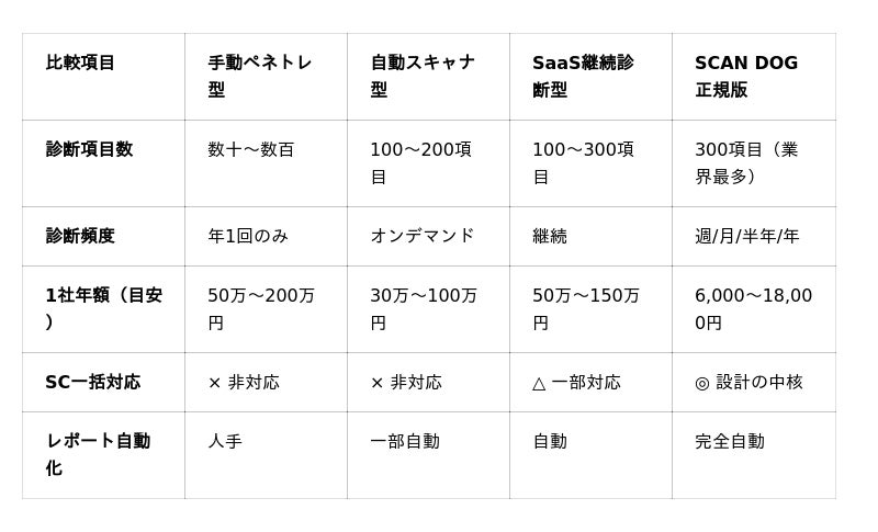 市場にはすでに手動ペネトレ型・自動スキャナ型・SaaS継続診断型の3カテゴリが存在します。SCAN DOG 正規版はそのいずれでもなく、「大企業がサプライチェーン全体を一括契約する自動化・継続・網羅型診断」という全く新しい第四のカテゴリです。