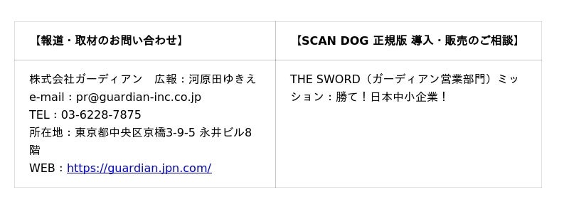 株式会社ガーディアン(代表取締役:青山裕一、所在地:東京都中央区京橋)は、WEBアプリケーションを対象とした脆弱性自動診断プラットフォーム「SCAN DOG 正規版」を正式リリースいたします。
